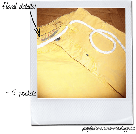 short gialli, camicia bianca con dettagli blu,