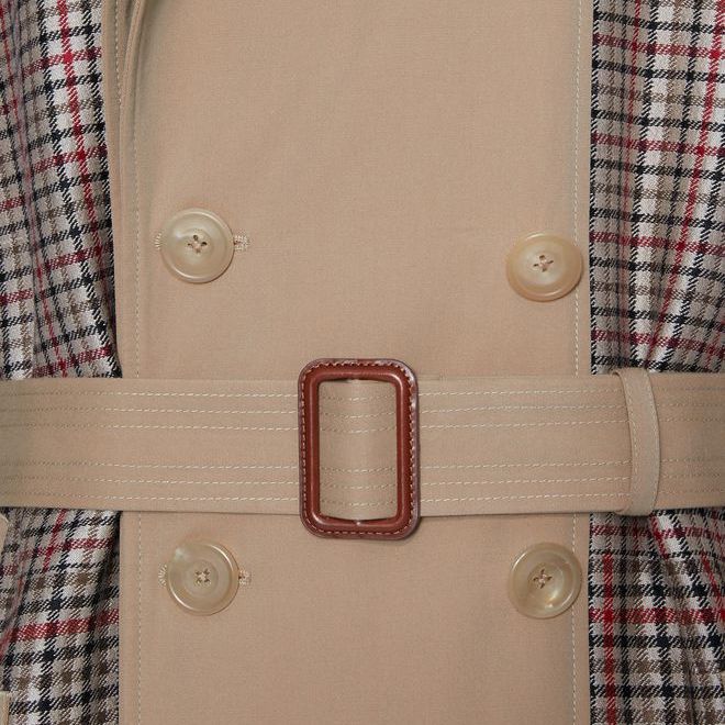 Why? Un classico trench inglese doppiopetto, ma decostruito, color beige dorato con pannelli in jacquard a quadri che sposano perfettamente i trend attuali.