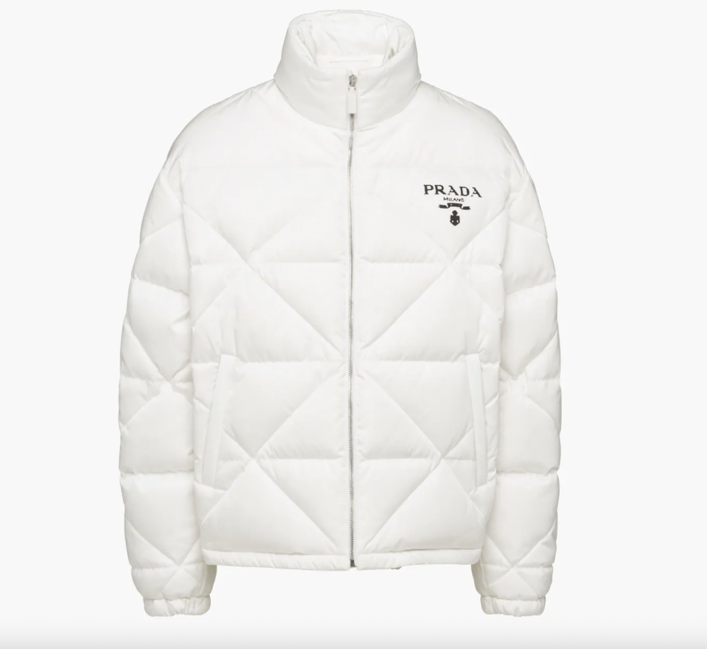 As is Prada‘s optical white all-over quilted jacket that evokes the iconic triangle logo. In Re-Nylon, a regenerated fabric made from recycled plastics collected from the oceans.